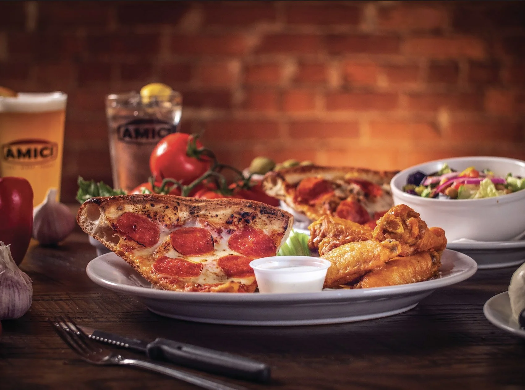 Amici is known for their pizza and hot wings, but there are many options, including salads, pastas and sandwiches on the menu for all to enjoy. Amici is that festive small-town restaurant and bar with a pleasant and attentive atmosphere dedicated to providing superior quality food to neighbors gathered around a table, where the only thing better than the food and service are the good times and friends enjoyed by all.