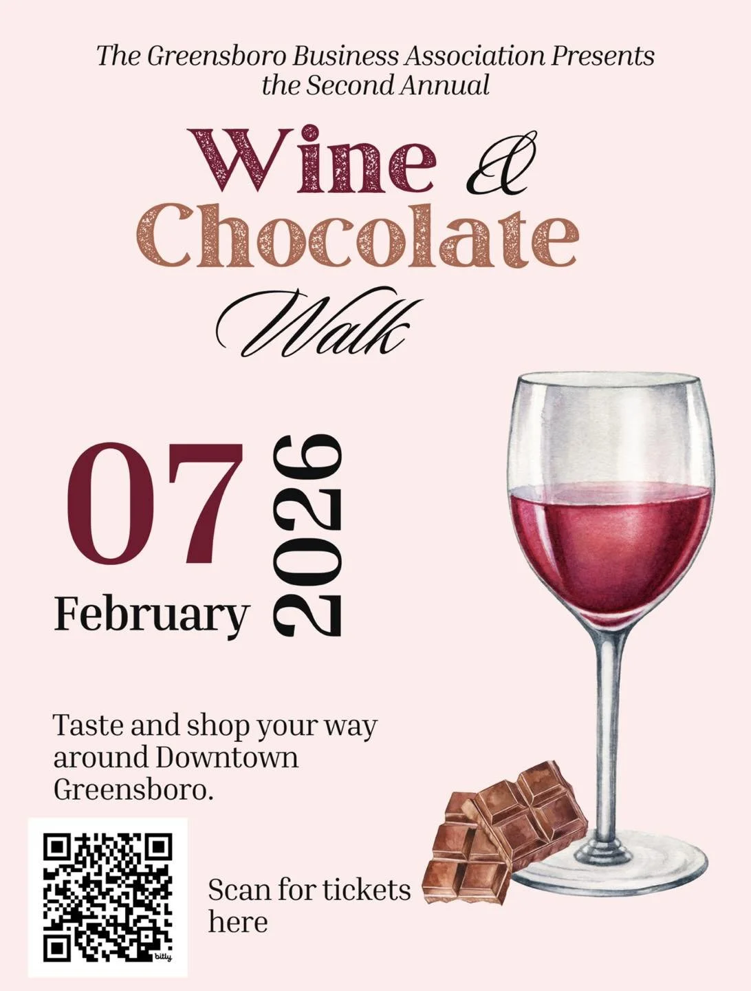 Downtown Greensboro invites guests to indulge in an afternoon of sweetness and small-town charm at the annual Wine & Chocolate Event on February 7 from 1 PM to 4 PM. Attendees can leisurely stroll through the historic district while sampling a curated selection of wines, decadent chocolates, and delicious treats from local shops and makers.