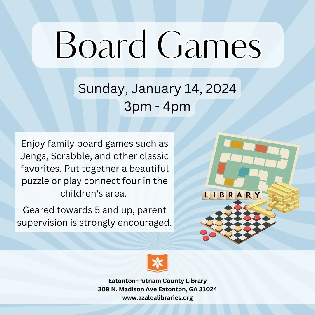Come to the library and enjoy family board games such as Jenga, Scrabble, and other classic favorites. Put together a beautiful puzzle or play connect four in the children's area. Suitable for ages 5 and up, parent supervision is required for children 16 and younger. For more information, please call the Eatonton Putnam Library at (706) 485-6768.