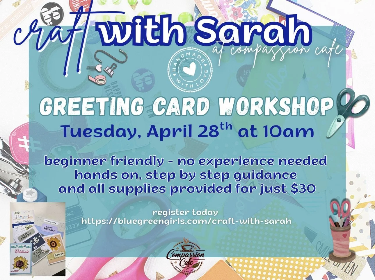 Compassion Café invites guests to enjoy a cozy and creative morning at the Craft with Sarah: Handmade Greeting Cards Workshop on Tuesday, April 28 from 10:00 AM to 12:00 PM.