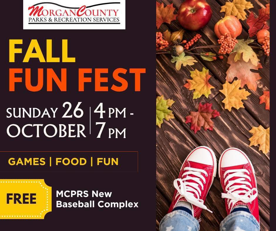 Celebrate the season with Morgan County Parks & Recreation Services at the Fall Fun Fest on Sunday, October 26 from 4–7 PM at the new MCPRS Baseball Complex!
