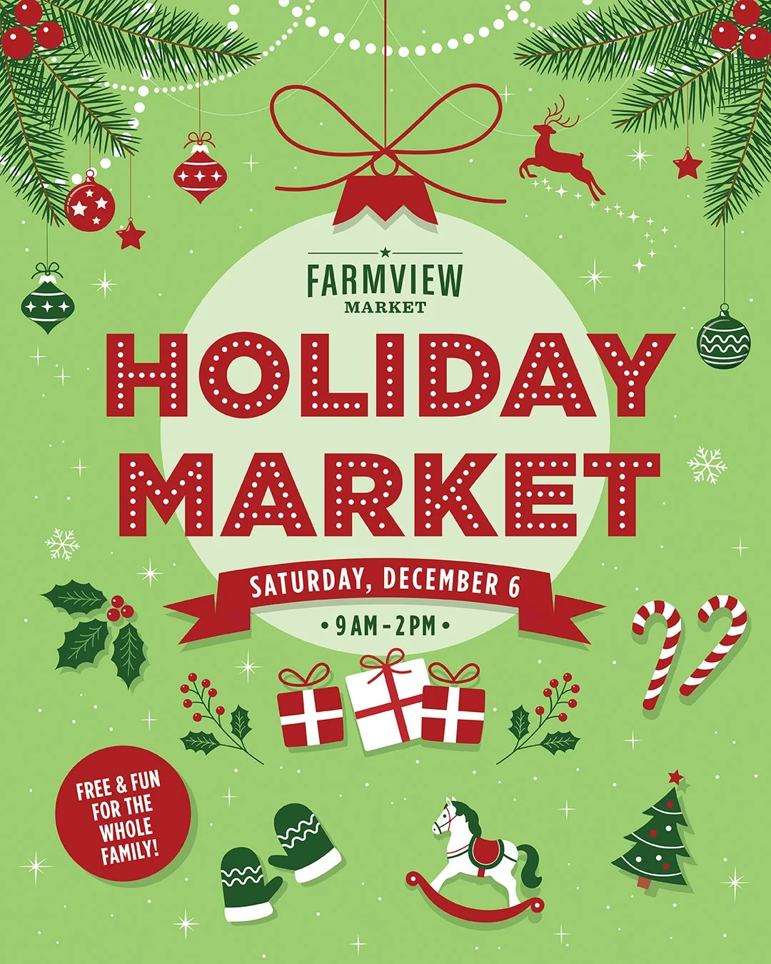 Celebrate the season at Farmview Market’s Holiday Market on Saturday, December 6 from 9:00am to 2:00pm, where festive fun and local charm come together for a full day of family-friendly holiday cheer. Guests can browse the open-air farmers market while enjoying live music, unique local gifts, and plenty of seasonal treats.