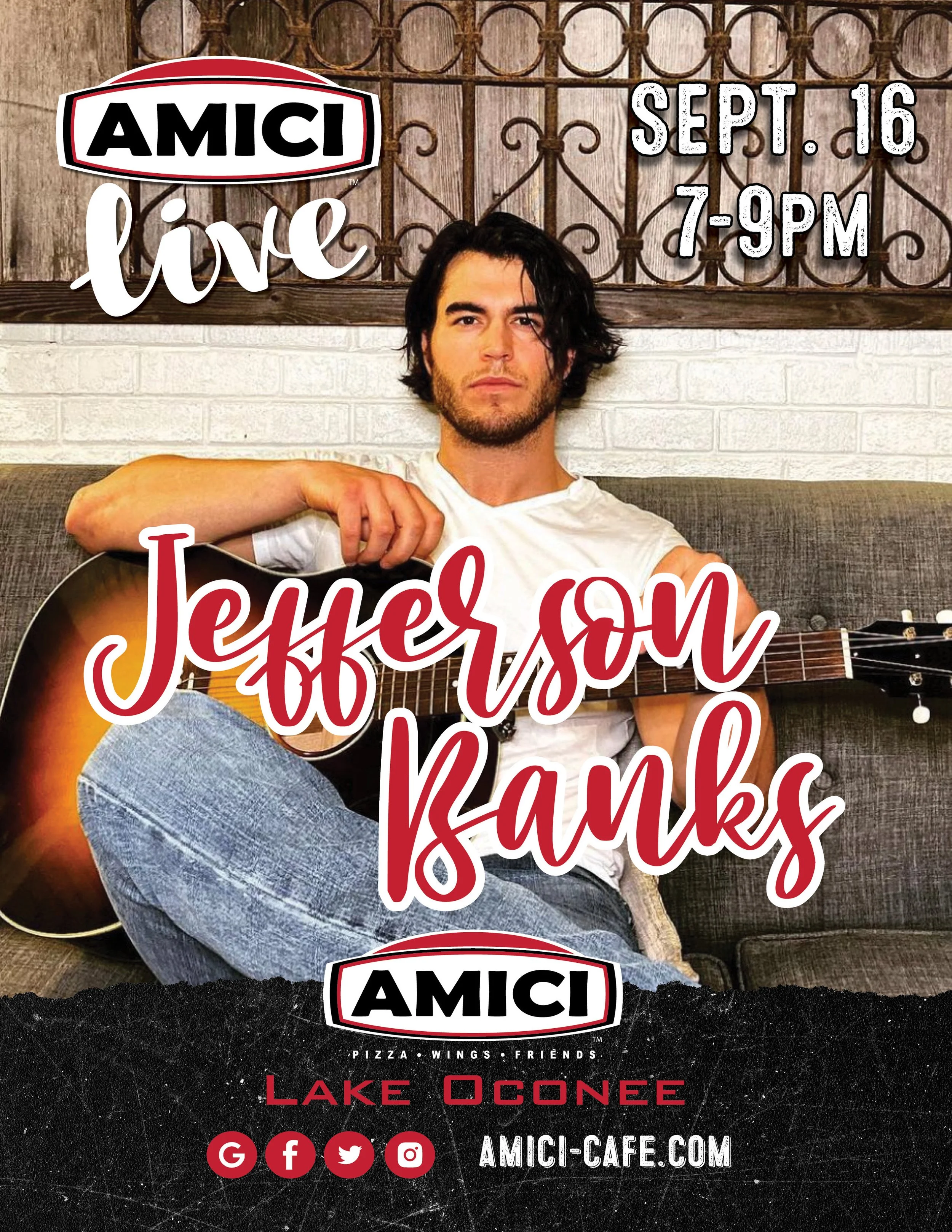 Jefferson Banks // Amici Lake Oconee Friday, September 16, 2022 7:00 PM 9:00 PM Amici Lake Oconee 1101 Parkside Main #105 Greensboro, GA, 30642 United States (map) Google Calendar ICS