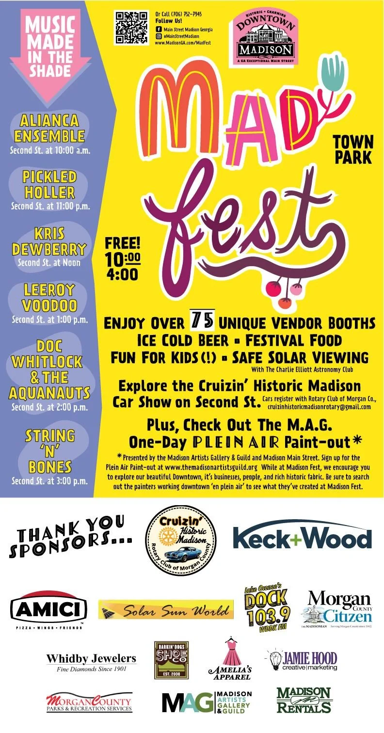 Madison Fest returns to Town Park for a full day of music, food, and family-friendly fun in the heart of historic downtown Madison. From 10:00 a.m. to 4:00 p.m., guests can enjoy live performances throughout the day, browse over 75 unique vendor booths, and sample delicious festival food and ice-cold drinks.