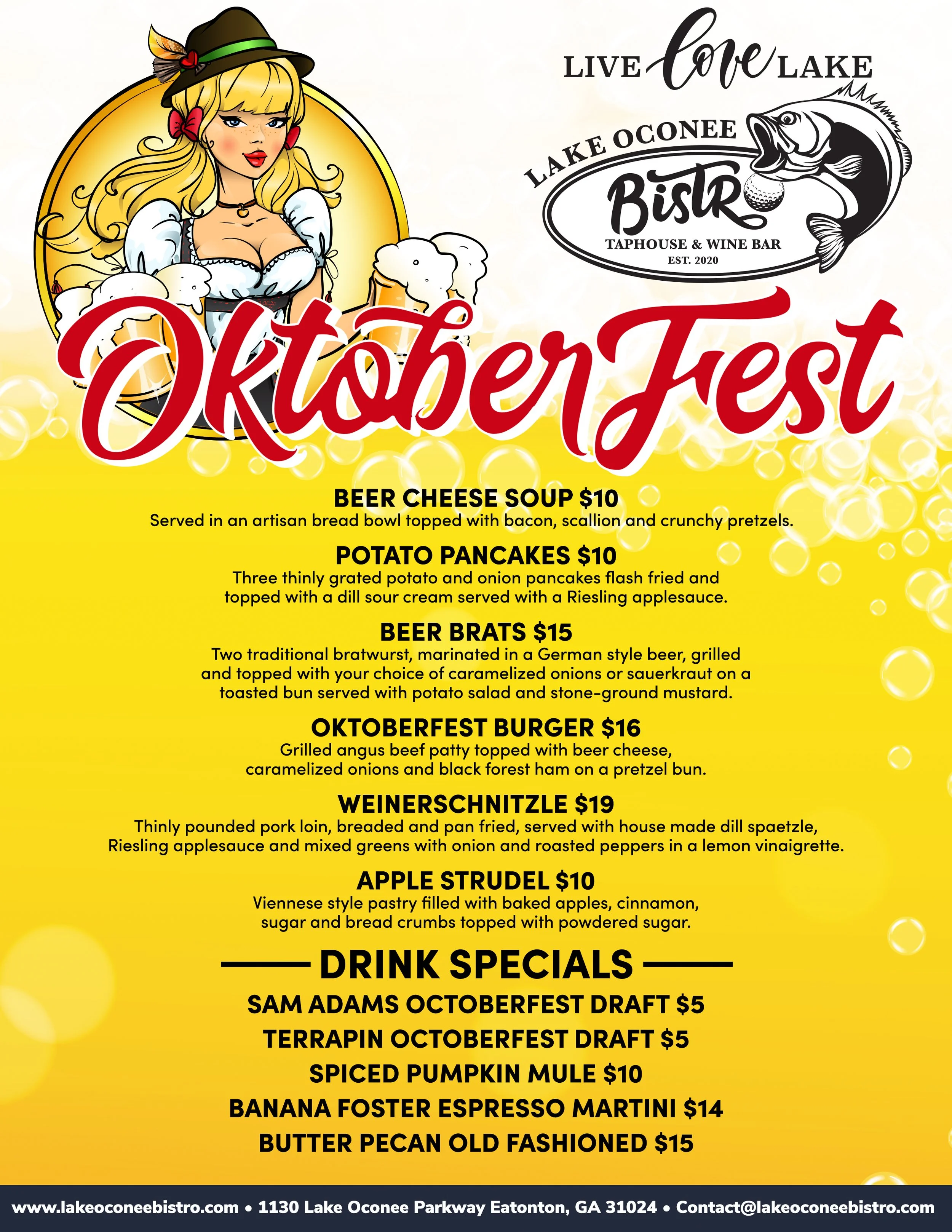 Celebrate OktoberFest all month long at Lake Oconee Bistro! Every weekend, Friday through Sunday, the Bistro will feature a festive menu full of German-inspired flavors. Enjoy Beer Cheese Soup served in an artisan bread bowl, crispy Potato Pancakes with Riesling applesauce, hearty Beer Brats, an OktoberFest Burger, traditional Weiner Schnitzel, or sweet Apple Strudel for dessert.
