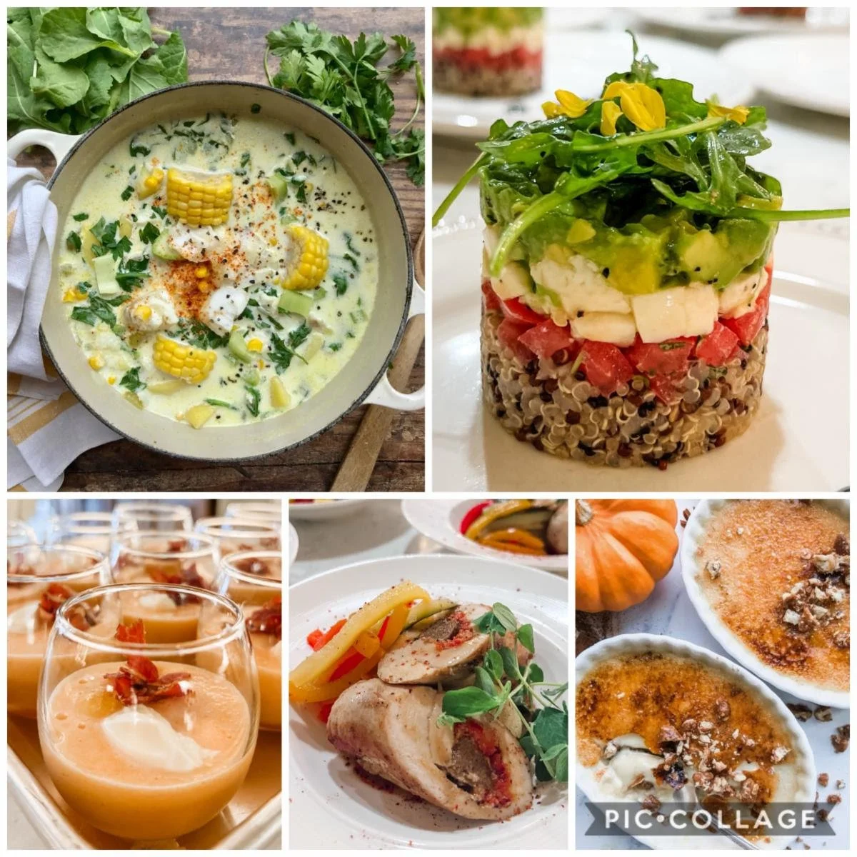 • Menu: Stuffed Figs, Corn & Cod Chowder, La Tour Gourmande, Melon Sorbet, Ballotine de Volaille au Chorizo, Pumpkin Spice Crème Brûlée