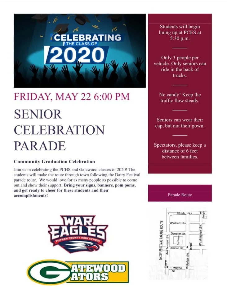 Putnam County Senior Celebration Parade Friday, May 22, 2020 6:00 PM 6:30 PM Downtown Eatonton 100 South Jefferson Avenue Eatonton, GA, 31024 United States (map) Google Calendar ICS PCHS’s and Gatewood’s classes of 2020 will be celebrated as they drive through downtown Eatonton. Please follow the guidelines in the flyer and letter penned by Kent Lawrence, Chief of Police. This flyer was distributed in downtown Eatonton.https://www.facebook.com/events/182484329567542/