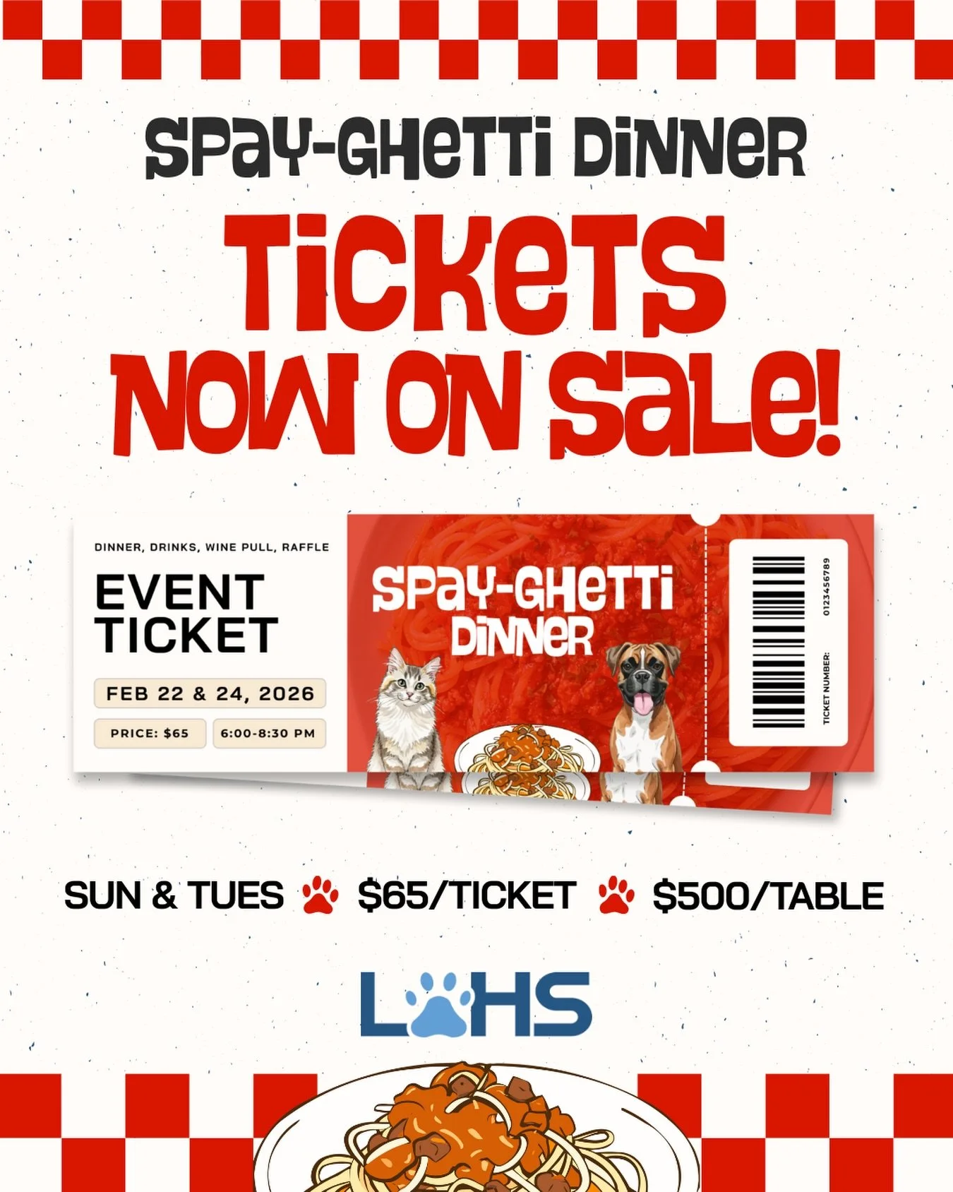 The Spay-ghetti Dinner is a meaningful way for the community to come together, share a great meal, and help reduce pet overpopulation through accessible veterinary care. Tickets are $65 per person with open seating, or $500 for a reserved table of eight (limited availability). Every plate served helps provide critical medical services and brighter futures for animals in need.